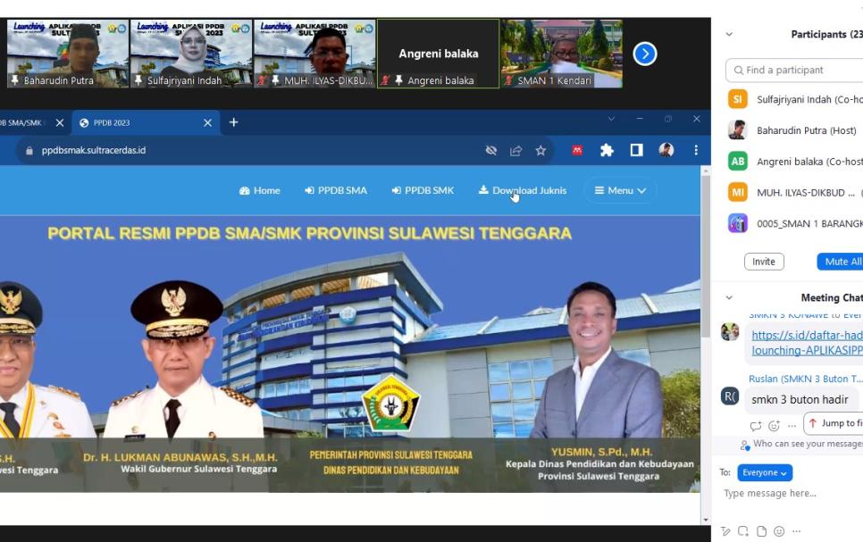 Sulawesi Tenggara - Dinas Pendidikan dan Kebudayaan Provinsi Sulawesi Tenggara telah sukses meluncurkan aplikasi Penerimaan Peserta Didik Baru (PPDB) Online untuk tahun pelajaran 2023/2024. Launching aplikasi ini diadakan melalui Zoom meeting yang diikuti oleh sekitar 300 guru, sejumlah Kepala Cabang Dinas (KCD), serta kepala sekolah dari jenjang SMA dan SMK dari 17 Kabupaten dan Kota di Provinsi Sulawesi Tenggara.
